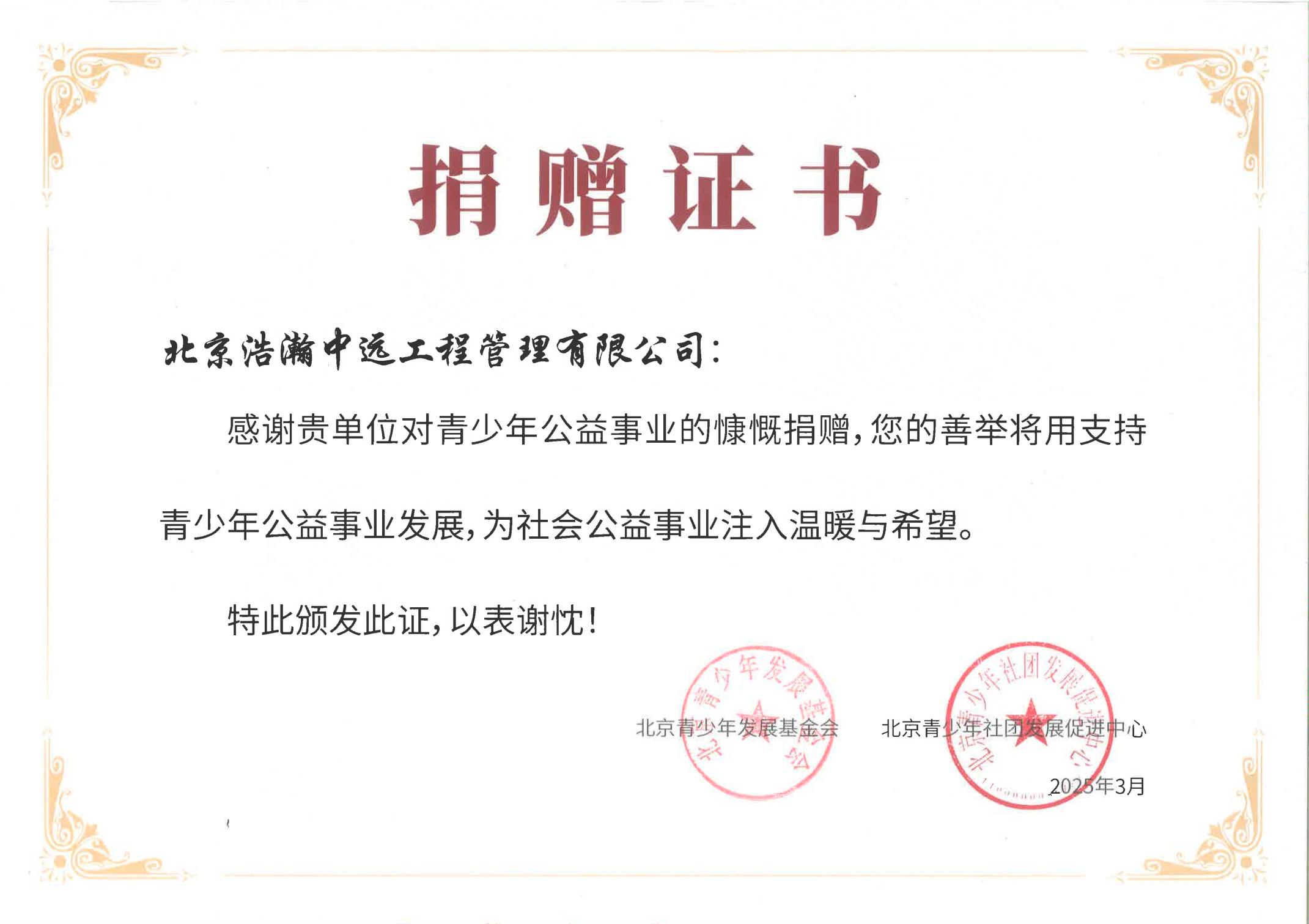 北京浩瀚中远工程管理有限公司深知在这个充满挑战与机遇并存的时代,企业的成长不仅源于市场的竞争与技术的革新,更离不开对社会责任的担当与回馈。董事长谢春蕾女士积极参与由北京青少年社团发展促进中心和北京青少年发展基金会联合发起的公益活动,在学雷锋月捐款至希望工程。