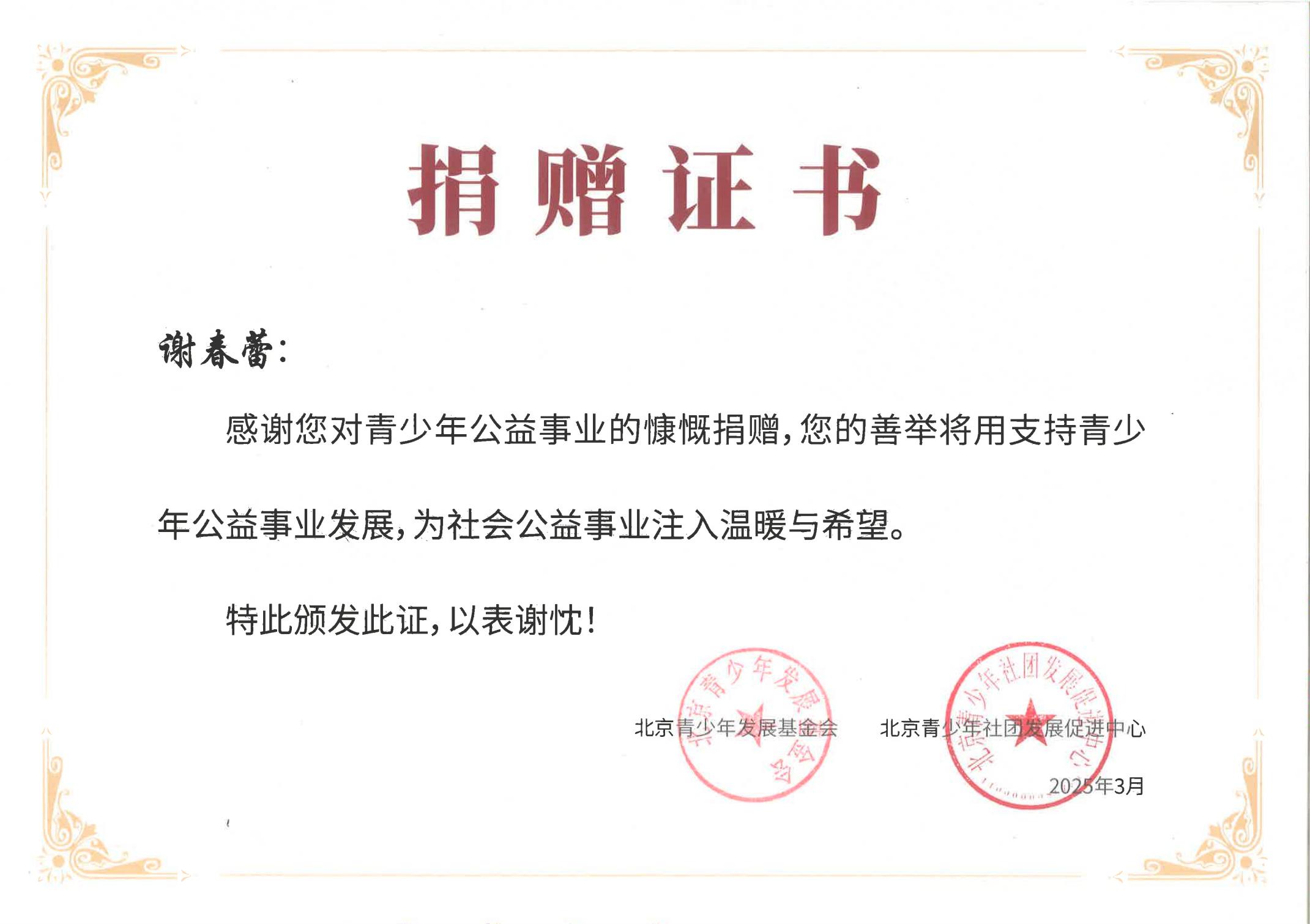 北京青少年社团发展促进中心和北京青少年发展基金会不仅为公司颁发捐赠证书,对于董事长谢春蕾女士的慷慨捐赠也特意颁发了证书。
